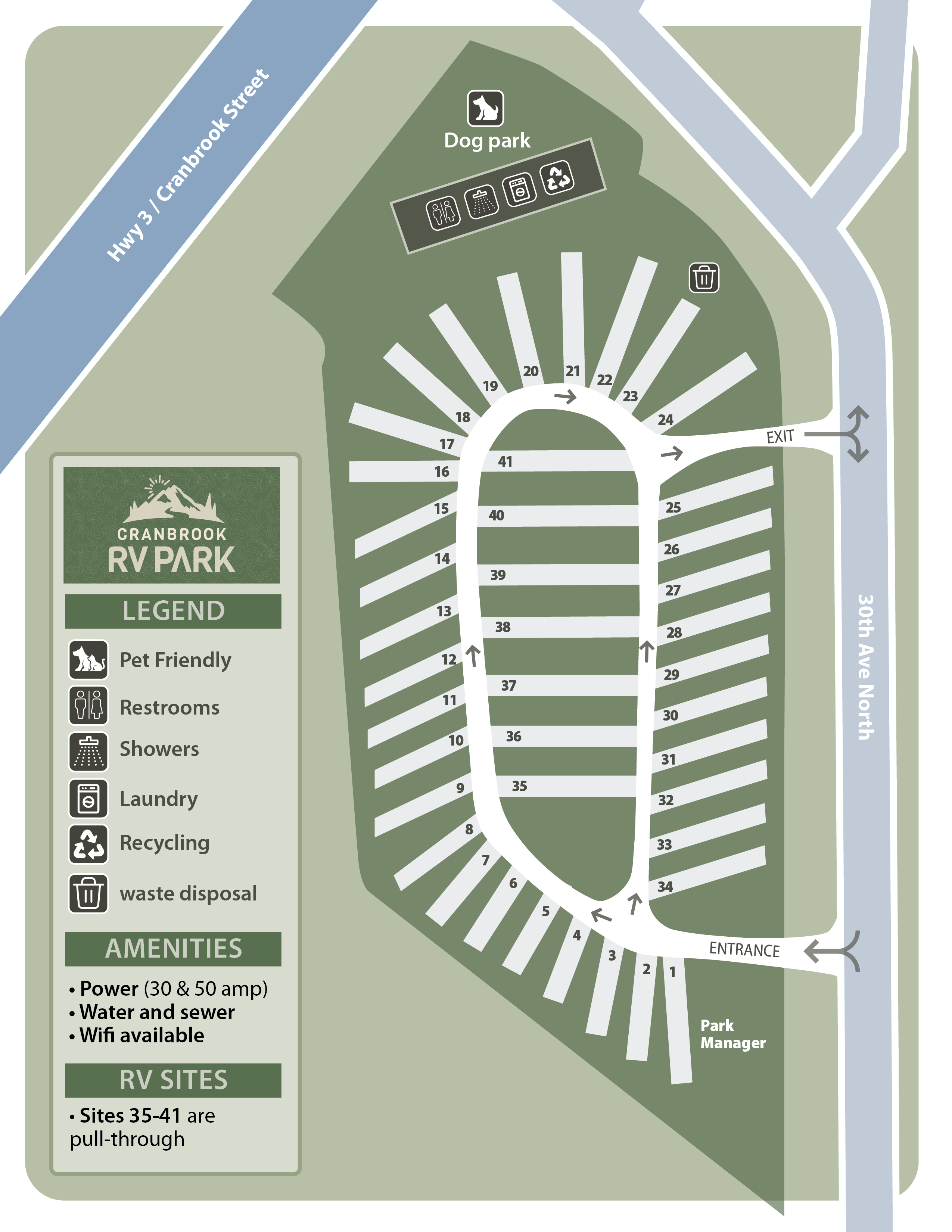 Cranbrook RV Park site map"Hi, I'm your host at Cranbrook RV Park, and I take pride in providing a safe, clean, and community-oriented environment. I personally make sure every lot is well cared for and that you have a safe and enjoyable stay, so you can feel right at home during your visit." — Tasha Rathburn